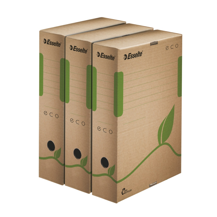 Box z archivačného systému Esselte ECO navrhnutý so zeleným prístupom. 100% recyklovateľný s 85% podielom spotrebiteľského odpadu, certifikovaný FSC. Veľkosť optimalizovaná iba na papiere A4 s cieľom minimalizovať odpad pri výrobe.