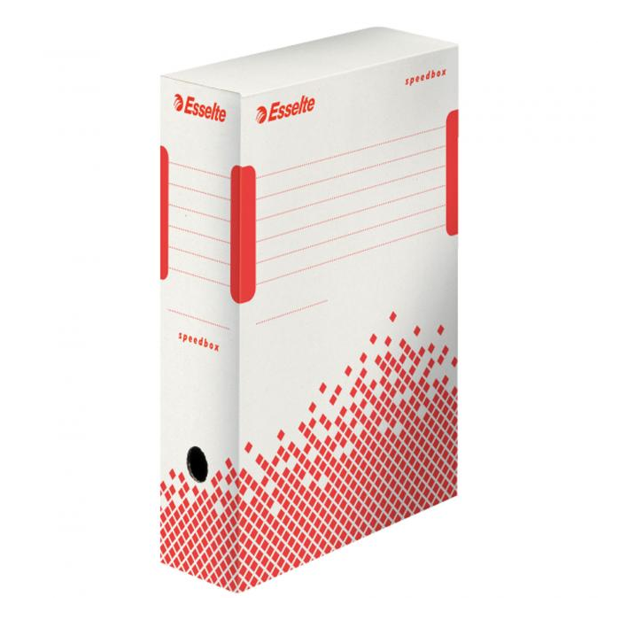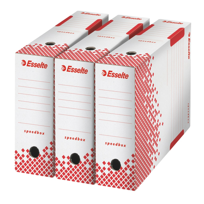 Archívny box z archivačného systému Speedbox. Dvojité bočnice chránia box pred otvorením a spevňujú okolie chrbtového úchytu. Vhodný pre dokumenty formátu A4. Ideálna veľkosť pre archiváciu v policiach, určené pre vertikálnu a horizontálnu archiváciu. Vyrobený zo 100% recyklovanej vlnitej lepenky. Chrbát 100 mm. Väčšie balenie 25 kusov.