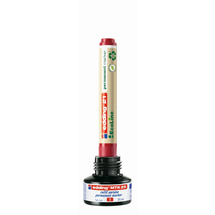 Atrament slabého zápachu s kapilárnym systémom na dopĺňanie permanentných popisovačov edding 2000/-2000 C, 2200/-2200 C, 400, 300, 330 a 370. Obsah 25 ml. Tento chemický prípravok je nebezpečný. Pri dopĺňaní vložte prednú časť popisovača špičkou do fľaštičky a po niekoľkých minútach bude popisovač pripravený k opätovnému použitiu. Obsah 25 ml.