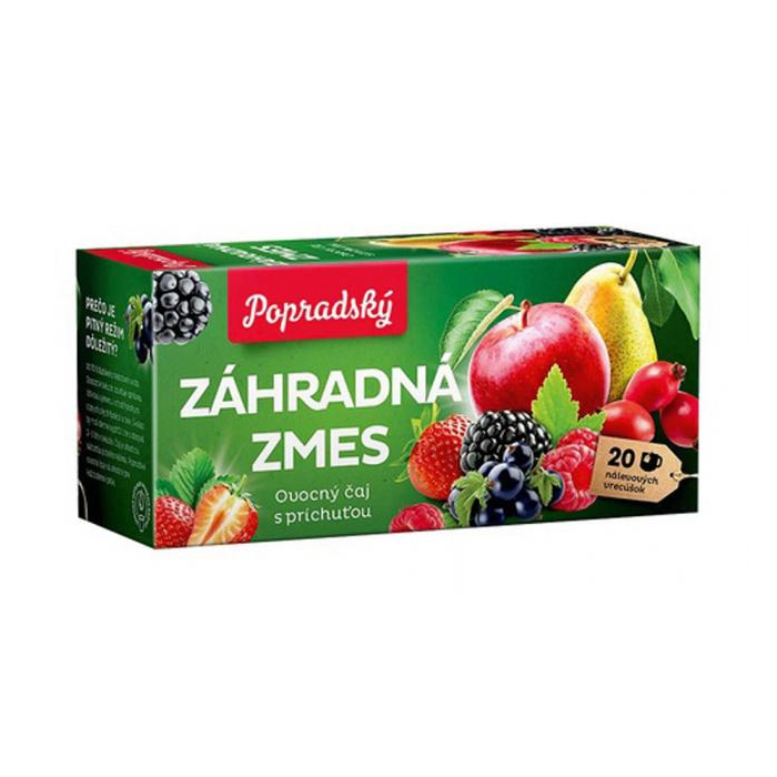 Aromatizovaný ovocný čaj s príchuťou Záhradná zmes. Porciovaný v nálevových vreckách.