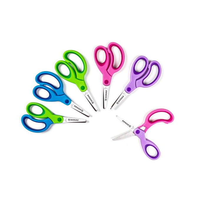 Detské nožnice s mäkkou rukoväťou, okrúhla čepeľ, prakticky nezničiteľné, 13 cm (5 palcov), 5-ročná záruka. Dostupné v 4 farbách, 6 kusov pre pravákov (ružová, fialová, zelená, modrá) a 6 kusov pre ľavákov s dvojfarebnými rukoväťami (ružová/fialová a zelená/modrá). Jednotlivo balené v blistri s eurodrážkami a 30 kusov v displeji.