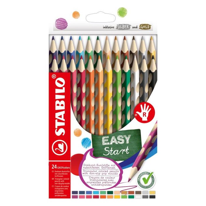 STABILO EASYcolors. Ergonomické trojhranné farbičky pre predškoské deti a školákov od 5 rokov. Prvá ergonomická farbička špeciálne pre ľavákov a pravákov. Trojhranný tvar a nekĺzavé úchopové plôšky zaisťujú uvoľnené držanie ruky. Žltý alebo červený koniec farbičky označuje ľavú alebo pravú verziu. Brilantné farby v dreve z udržateľného lesného hospodárstva. Farbičky sú vyrobené z dreva certifikovaného PEFC® (PEFC/04-31-1728). Každá farbička má štítok na meno.
