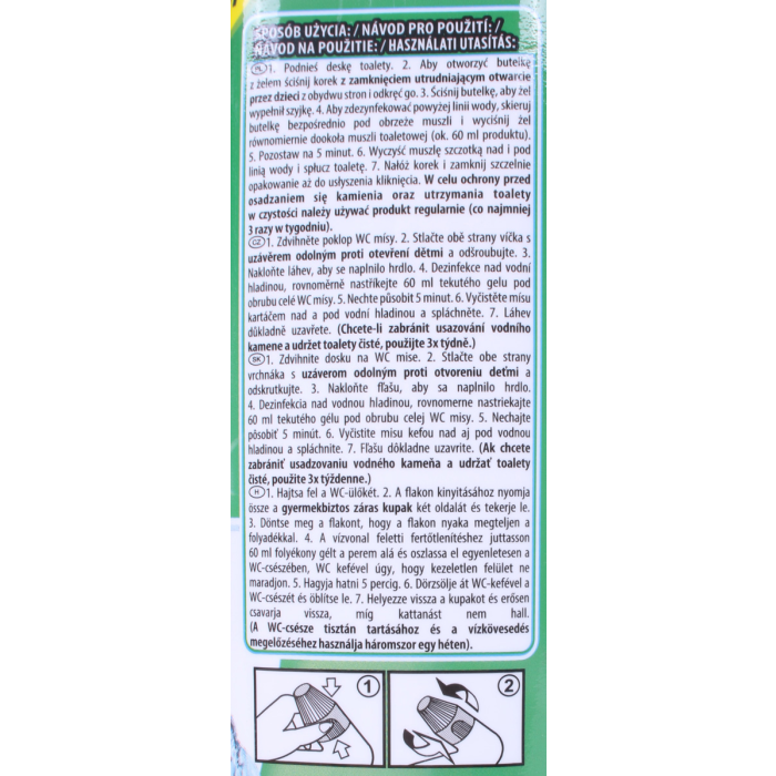 Používajte len na WC misy. Nemiešajte s bieliacimi činidlami a ani inými domácimi čistiacimi prípravkami.