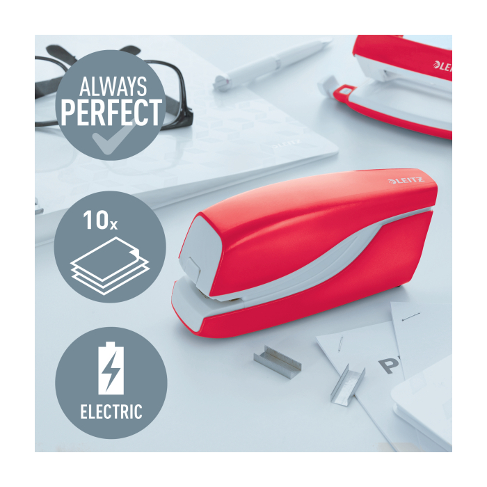 Elektrická zošívačka Leitz New NeXXt WOW. Vďaka jednoduchému ovládaniu jednou rukou je ideálna na časté používanie. Technológia s napájaním na batérie na zošívanie v pohybe. V žiarivých farbách WOW. Batérie (4× 1,5 V AAA LR03) nie sú súčasťou balenia. Kapacita 10 listov. Náhradné spinky ES556800. Farba červená.