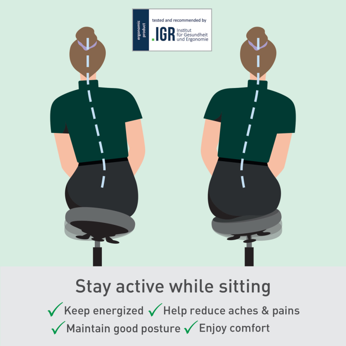 Trojuholníkový tvar sedadla, podobný sedlovým stoličkám, rovnomerne rozkladá hmotnosť na panvové kosti. Mäkké penové čalúnenie znižuje tlak na stehná a nohy celkovo.