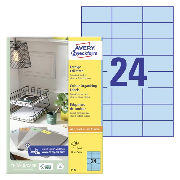 Etikety farebné 70x37mm Avery A4 100 hárkov modré
