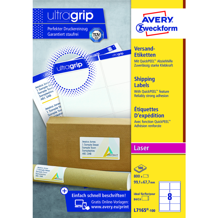 Biele etikety vhodné ako prepravné štítky na zásielky. Vďaka inovatívnej technológii ultragrip sa môžete spoľahnúť na bezchybné natiahnutie archu a tlač bez zasekávania. Bezpečnostný okraj QCT zabraňuje zanášaniu tlačiarne lepidlom. Rýchla technológia QuickPEEL™ zabezpečí, že etiketu odlepíte z podkladového papiera za sekundu. Šablóny a softvér pre jednoduchú a rýchlu tlač etikiet sú k dispozícii zdarma na www.avery-zweckform.cz/software/avery-design-print. Sú vhodné pre všetky štandardné laserové tlačiarne. Pre laserové tlačiarne testované a certifikované TÜV SÜD. Rozmer 99,1 x 67,7 mm. Balenie 100 hárkov.