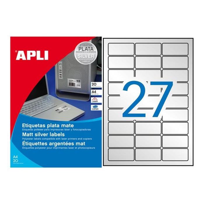 Etikety polyesterové 63,5x29,6mm APLI A4 20 hárkov strieborné