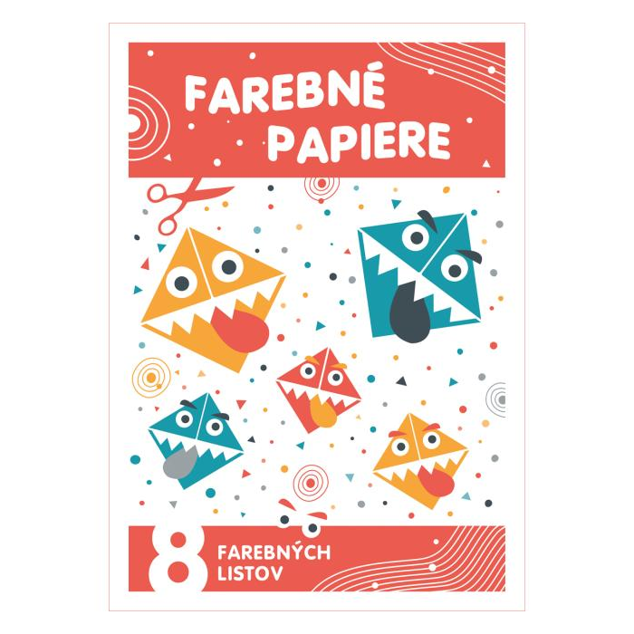 Farebný papier v zložke ako kreatívny materiál pre detskú fantáziu. Obsahuje farebné hárky: črevená, čierna, hnedá, modrá, oranžová, sivá, zelená, žltá.