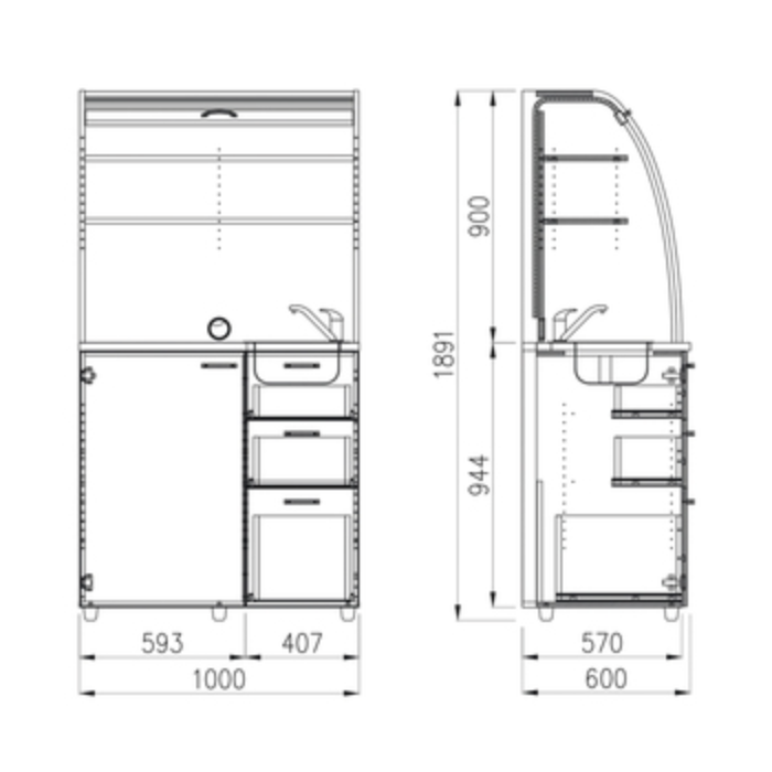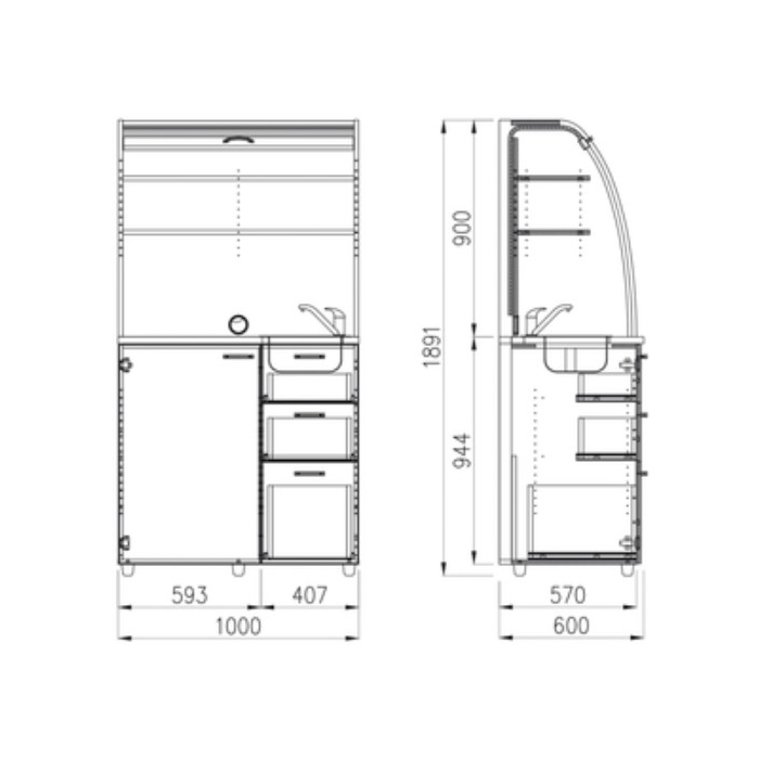 • Dve police vo vrchnej časti kuchynky poskytujú dostatočnú kapacitu na poháre, šálky a taniere. Na pracovnú dosku môžete umiestniť napr. kávovar a káblovou priechodkou v zadnej časti vyvediete kábel z priestoru kuchynky.
