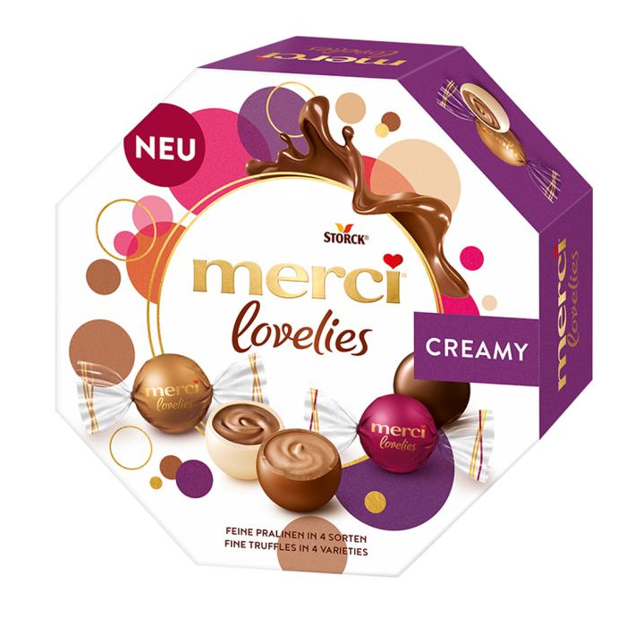 Okrúhly pôžitok s krémovým jadrom. Lahodné Merci Lovelies Creamy zvádzajú nielen svojou jemnou náplňou, ale aj plnou chuťou. Chrumkavá škrupina z troch rôznych druhov čokolády obklopuje jemné jadro so sladkou krémovou náplňou, ktorá sa lahodne rozpúšťa v ústach. Skutočné potešenie z krásnych okamihov v živote. Darčeková krabička so 14 jednotlivo balenými čokoládami v 4 príchutiach. Balenie meria cca 15 x 15 x 5cm a obsahuje tieto druhy: mliečna pralinka, nugát, horká pralinka, cappuccino krém.