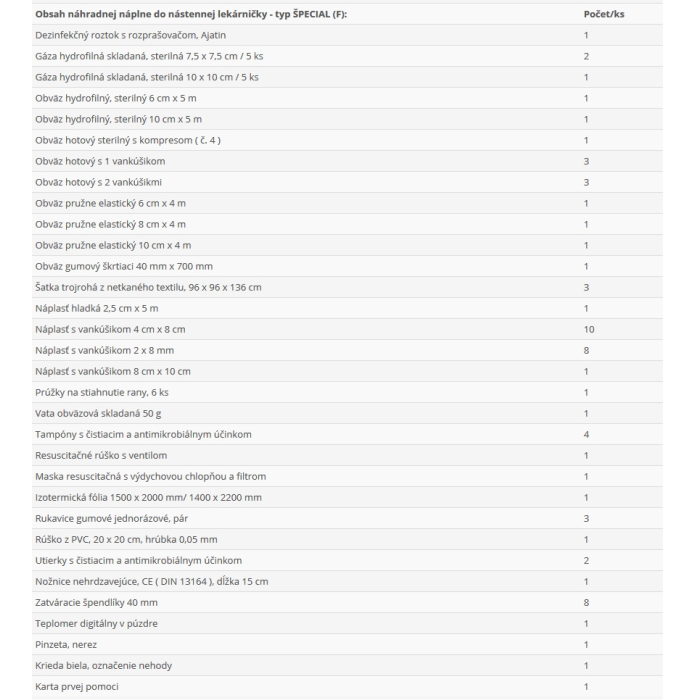 Náplň do lekárničky s rozšírenou výbavou, vhodná na pracoviská s vyššou mierou rizika úrazu, najmä na miesta so zvýšeným rizikom pádov a poranení, omrzlín, popálenín a i. Odporúčaná do výrobných podnikov, škôl, potravinárskych prevádzok, dielní, lakovní, autoservisov, opravárenských podnikov a pod.