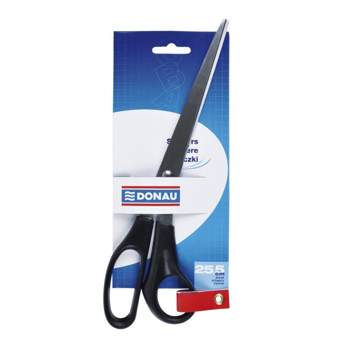 Univerzálne kancelárske nožnice na strihanie papiera, kartónu, lepenky, samolepiacej pásky a pod. so strihacou časťou z nehrdzavejúcej ocele. Farba čierna. Väčšie balenie 12 ks.