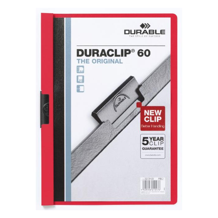 Obal vyvinutý spoločnosťou DURABLE pre viazanie nedierovaných listov. Materiál z PVC s unikátnym kovovým klipom, ktorý sa prispôsobí vloženému počtu listov a priehľadnou prednou stranou. Ideálny na prezentácie, ponuky, správy, poznámky na konferencie, semináre a pod. Formát A4. Kapacita 1-60 listov. Väčšie balenie 25 ks.