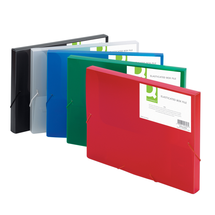 Transparentný plastový box s tromi chlopňami vyrobený z polypropylénu, uzatvárateľný gumičkou. Kapacita 250 listov, šírka chrbta 25 mm. Farba mliečna.