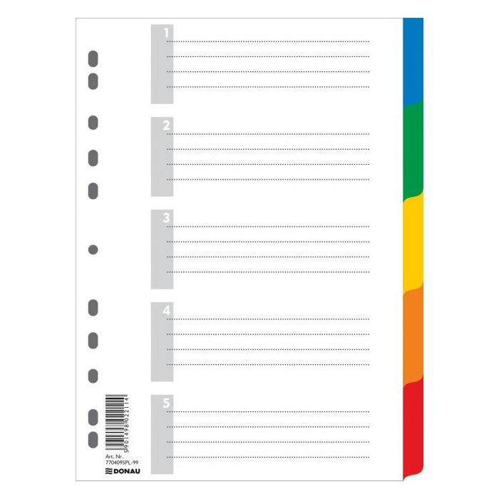 5-dielny A4 plastový farebný rozraďovač s eurodierovaním a titulným listom na popisovanie obsahu. Balenie jedna sada v polyesterovom sáčku. Väčšie balenie 25 sád.