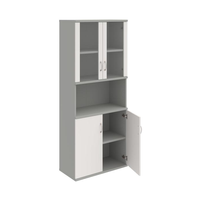 Kombinovaná skriňa - dvere/nika. Kancelárske skrine STRONG majú robustnú konštrukciu a vyššiu nosnosť políc ako bežné kancelárske skrine.V ponuke sú skriňové moduly s výškou 185 cm, 111 cm alebo 74 cm a šírky 80 cm alebo 40 cm. Hĺbka všetkých modelov skriňového radu STRONG je 40 cm.Chrbát, vyrobený z 8 mm hrubých dosák, je obojstranne pohľadový, takže skrine môžete použiť ako priestorový deliaci prvok. Hrúbka samotných políc je 25 mm, čo znamená nosnosť 80 kg na 1 policu.Korpusy, dvierka a police skríň sú olepené odolnou 2mm ABS hranou, ktorá garantuje dostatočnú ochranu proti poškodeniu.