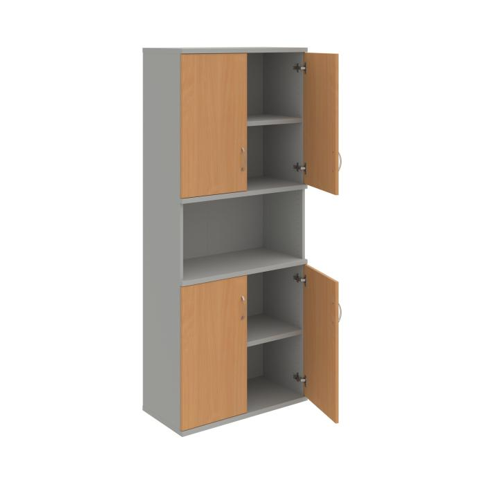 Kombinovaná skriňa - dvere/nika. Kancelárske skrine STRONG majú robustnú konštrukciu a vyššiu nosnosť políc ako bežné kancelárske skrine.V ponuke sú skriňové moduly s výškou 185 cm, 111 cm alebo 74 cm a šírky 80 cm alebo 40 cm.Hĺbka všetkých modelov skriňového radu STRONG je 40 cm.Chrbát, vyrobený z 8 mm hrubých dosák, je obojstranne pohľadový, takže skrine môžete použiť ako priestorový deliaci prvok. Hrúbka samotných políc je 25 mm, čo znamená nosnosť 80 kg na 1 policu.Korpusy, dvierka a police skríň sú olepené odolnou 2mm ABS hranou, ktorá garantuje dostatočnú ochranu proti poškodeniu.