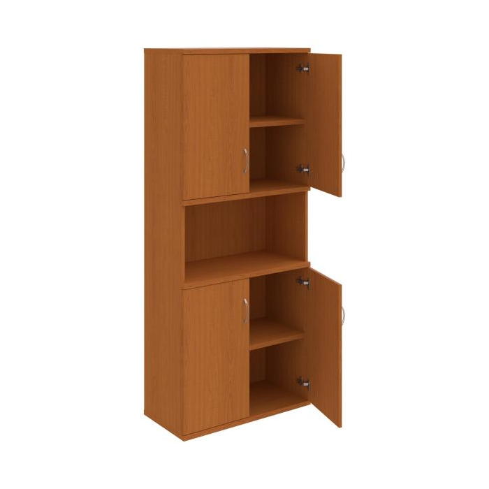 Kombinovaná skriňa - dvere/nika. Kancelárske skrine STRONG majú robustnú konštrukciu a vyššiu nosnosť políc ako bežné kancelárske skrine.V ponuke sú skriňové moduly s výškou 185 cm, 111 cm alebo 74 cm a šírky 80 cm alebo 40 cm.Hĺbka všetkých modelov skriňového radu STRONG je 40 cm.Chrbát, vyrobený z 8 mm hrubých dosák, je obojstranne pohľadový, takže skrine môžete použiť ako priestorový deliaci prvok. Hrúbka samotných políc je 25 mm, čo znamená nosnosť 80 kg na 1 policu.Korpusy, dvierka a police skríň sú olepené odolnou 2mm ABS hranou, ktorá garantuje dostatočnú ochranu proti poškodeniu.
