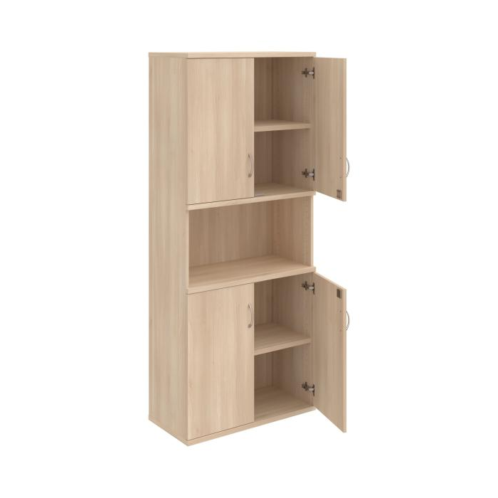 Kombinovaná skriňa - dvere/nika. Kancelárske skrine STRONG majú robustnú konštrukciu a vyššiu nosnosť políc ako bežné kancelárske skrine.V ponuke sú skriňové moduly s výškou 185 cm, 111 cm alebo 74 cm a šírky 80 cm alebo 40 cm.Hĺbka všetkých modelov skriňového radu STRONG je 40 cm.Chrbát, vyrobený z 8 mm hrubých dosák, je obojstranne pohľadový, takže skrine môžete použiť ako priestorový deliaci prvok. Hrúbka samotných políc je 25 mm, čo znamená nosnosť 80 kg na 1 policu.Korpusy, dvierka a police skríň sú olepené odolnou 2mm ABS hranou, ktorá garantuje dostatočnú ochranu proti poškodeniu.