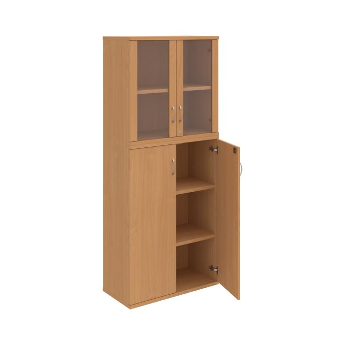 Kombinovaná skriňa - dvere/nika. Kancelárske skrine STRONG majú robustnú konštrukciu a vyššiu nosnosť políc ako bežné kancelárske skrine.V ponuke sú skriňové moduly s výškou 185 cm, 111 cm alebo 74 cm a šírky 80 cm alebo 40 cm. Hĺbka všetkých modelov skriňového radu STRONG je 40 cm.Chrbát, vyrobený z 8 mm hrubých dosák, je obojstranne pohľadový, takže skrine môžete použiť ako priestorový deliaci prvok. Hrúbka samotných políc je 25 mm, čo znamená nosnosť 80 kg na 1 policu.Korpusy, dvierka a police skríň sú olepené odolnou 2mm ABS hranou, ktorá garantuje dostatočnú ochranu proti poškodeniu.