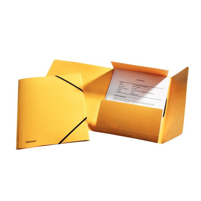 Obal A4 s tromi chlopňami a čiernou gumičkou. Materiál na dotyk príjemný prešpán. Prelisy na chlopniach a chrbte zvyšujú kapacitu obalu. Väčšie balenie 10 ks.