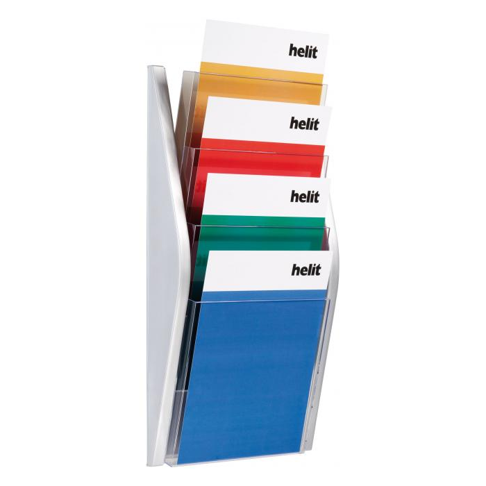 Nástenný stojan na prezentáciu materiálov. Štyri priehľadné priehradky slúžia na umiestnenie materiálov formátu A4. Materiál kvalitný plast. Rozmery (š x v x h) 275 x 540 x 80 mm. Farba strieborná.