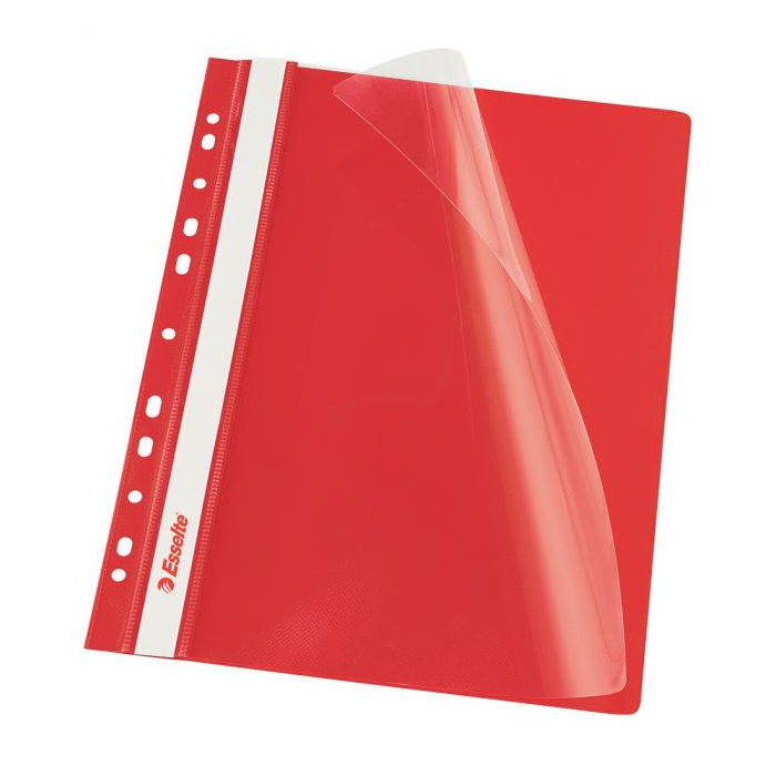 Obal s eurodierovaním z kvalitného PVC na uloženie dierovaných dokumentov do formátu A4. Predná strana priehľadná, pozdĺž chrbta biely obojstranný papierový zasúvací štítok. Rozmery 310 × 235 mm. Farba červená.