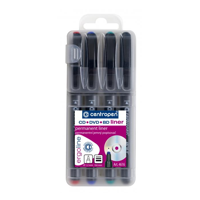 Liner s jemným plastovým hrotom v novom ergonomickom dizajne určený na popisovanie CD, DVD a BD diskov. Permanentný atrament na alkoholovej báze. Šírka stopy 0,6 mm. Sada 4 základných farieb.