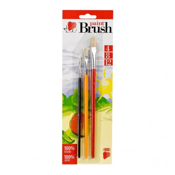 Sada 3 plochých školských štetcov s farebnou rúčkou. Štetina 100% poník. Ideálne na maľovanie vodovými a temperovými farbami. Šírka štetiny 4-8-12 mm.