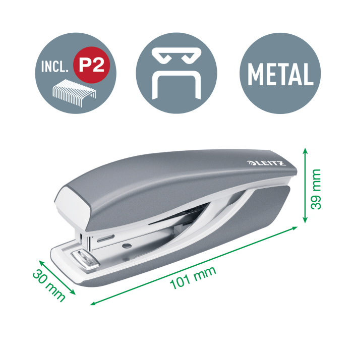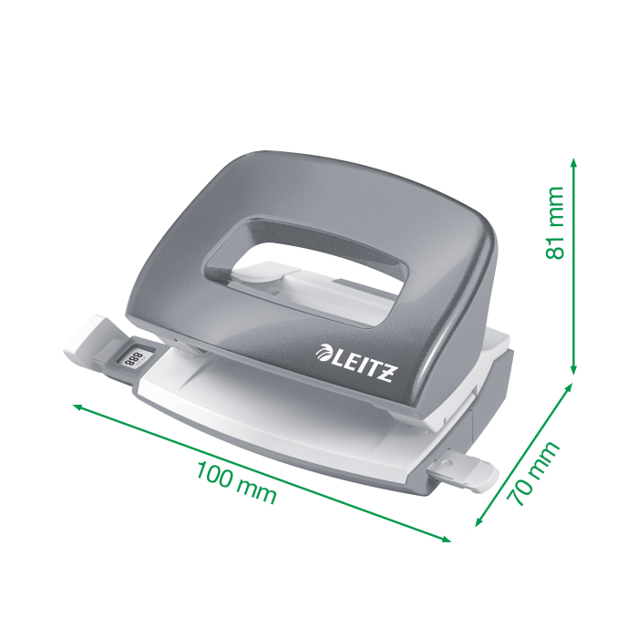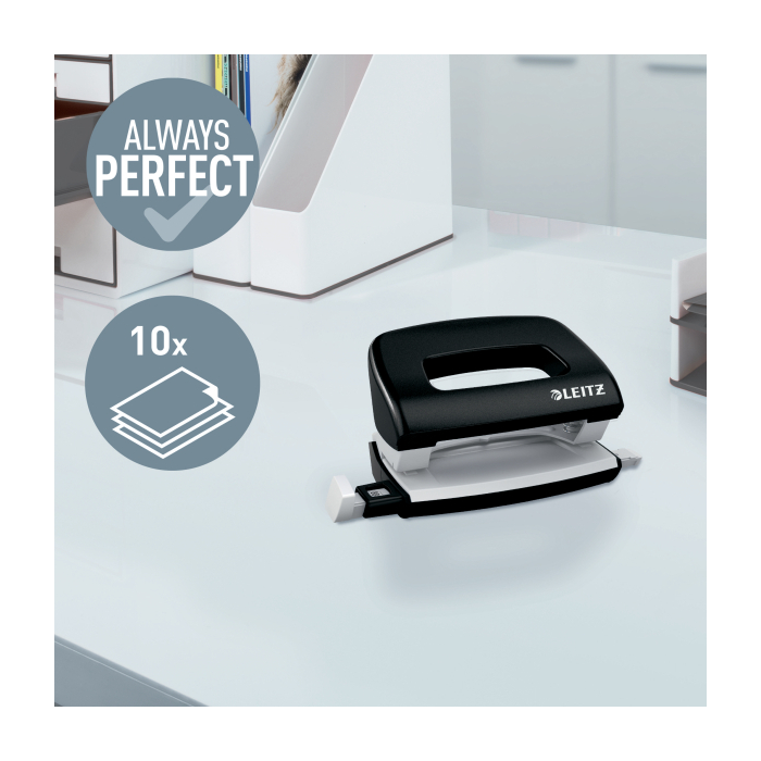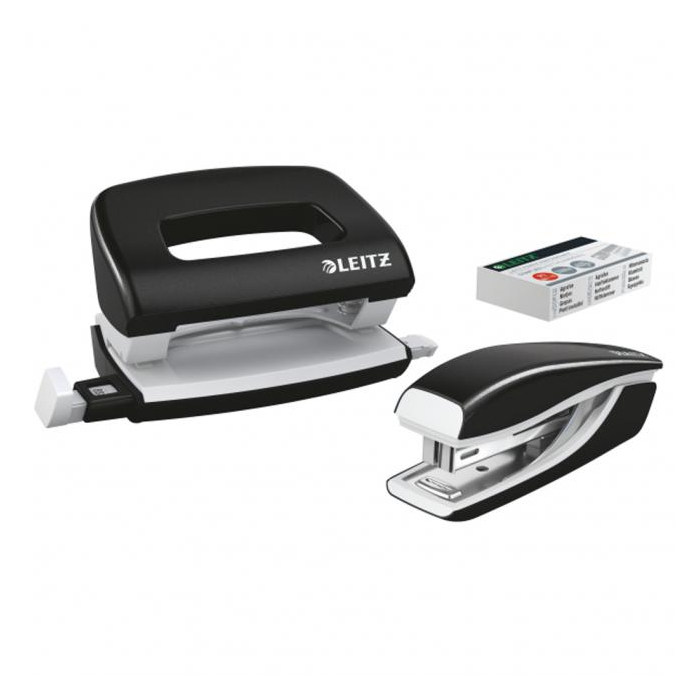 Minisúprava v moderných farbách. Malé a kompaktné rozmery. Kapacita 10 hárkov. Celokovová minizošívačka a dierovačka na použitie v kancelárii aj na cestách. Zošívačka s otvorením ramena o 180° na nástenkové zošívanie. Použite spinky Leitz Power Performance P2, č. 10, jedna škatuľka spiniek je súčasťou balenia. Dierovačka má príložník s kontrastnou potlačou jednotlivých formátov, rámček na jasné určenie formátu. Balenie v blistri. Farba čierna.