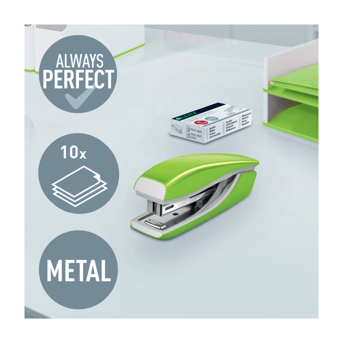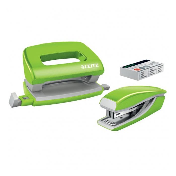 Minisúprava v moderných farbách. Malé a kompaktné rozmery. Kapacita 10 hárkov. Celokovová minizošívačka a dierovačka na použitie v kancelárii aj na cestách. Zošívačka s otvorením ramena o 180° na nástenkové zošívanie. Použite spinky Leitz Power Performance P2, č. 10, jedna škatuľka spiniek je súčasťou balenia. Dierovačka má príložník s kontrastnou potlačou jednotlivých formátov, rámček na jasné určenie formátu. Balenie v blistri. Farba zelená.