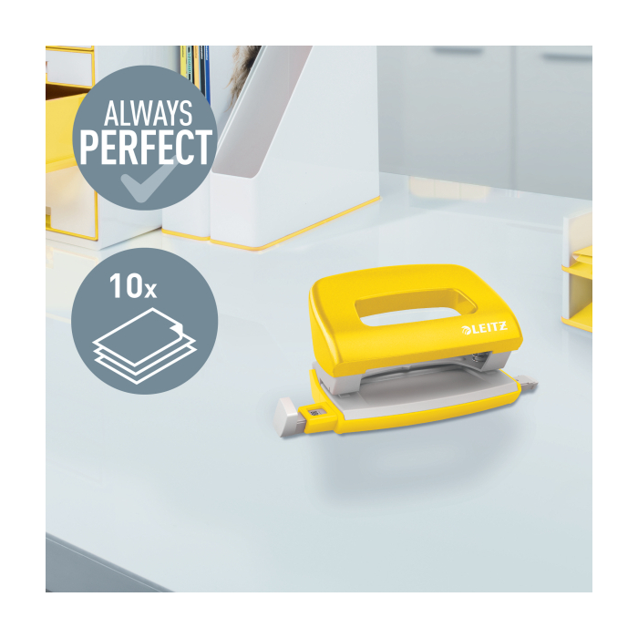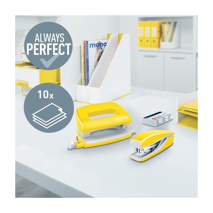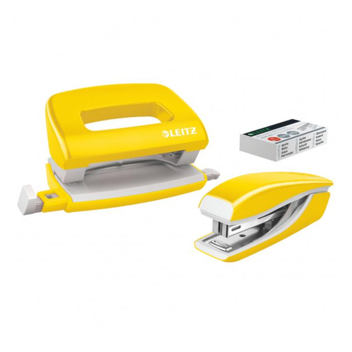 Minisúprava v moderných farbách. Malé a kompaktné rozmery. Kapacita 10 hárkov. Celokovová minizošívačka a dierovačka na použitie v kancelárii aj na cestách. Zošívačka s otvorením ramena o 180° na nástenkové zošívanie. Použite spinky Leitz Power Performance P2, č. 10, jedna škatuľka spiniek je súčasťou balenia. Dierovačka má príložník s kontrastnou potlačou jednotlivých formátov, rámček na jasné určenie formátu. Balenie v blistri. Farba žltá.