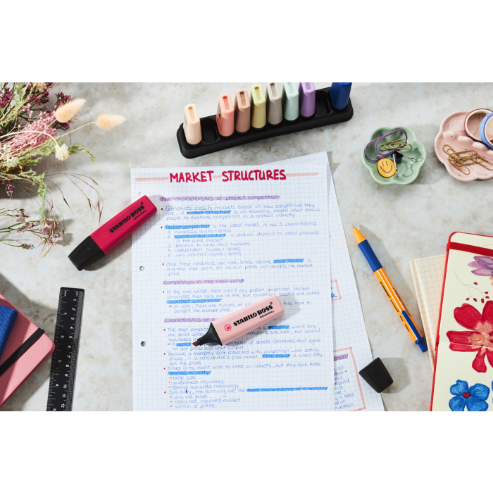 Zvýrazňovač STABILO BOSS ORIGINAL NatureCOLORS Wildflower ponúka moderné odtiene a jemný zvýraznený efekt, ktorý oživí akýkoľvek dokument alebo študijný materiál. Štyri odtiene - ultramarínová, bordová, šedofialová a púdrová ružová - sú ideálne pre každého, kto chce do svojej písacej súpravy priniesť módne farby z interiéru a módneho dizajnu. Vďaka technológii STABILO Anti-Dry-Out zostáva tento kvalitný zvýrazňovač použiteľný až 4 hodiny bez vysychania, takže môžete bez obáv melírovať aj pri dlhšej práci. Univerzálny klinový hrot umožňuje šírku čiary 2 mm alebo 5 mm, čo je ideálne na zvýraznenie aj jemné čiary. Či už sa pripravujete na skúšky alebo si organizujete poznámky, tento zvýrazňovač je nepostrádateľným nástrojom pre profesionálnu prácu aj kreatívne činnosti, ako je journaling alebo hand lettering.