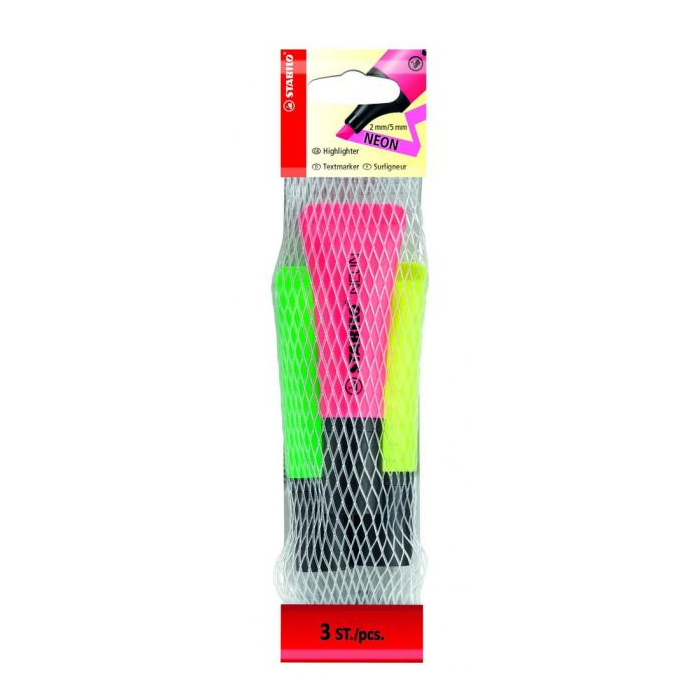 Zvýrazňovač s atramentom na vodnej báze v novom tvare tuby s mäkkou úchytovou zónou, príjemnou pri manipulácii a držaní. Použitá STABILO Anti-Dry-Out technológia zabezpečuje až 4-hodinovú ochranu pred vyschnutím atramentu pri nepoužívaní vrchnáka. Zrezaný hrot, šírka stopy 2 - 5 mm. Sada 3 neónových farieb - žltá, oranžová, zelená v sieťke.