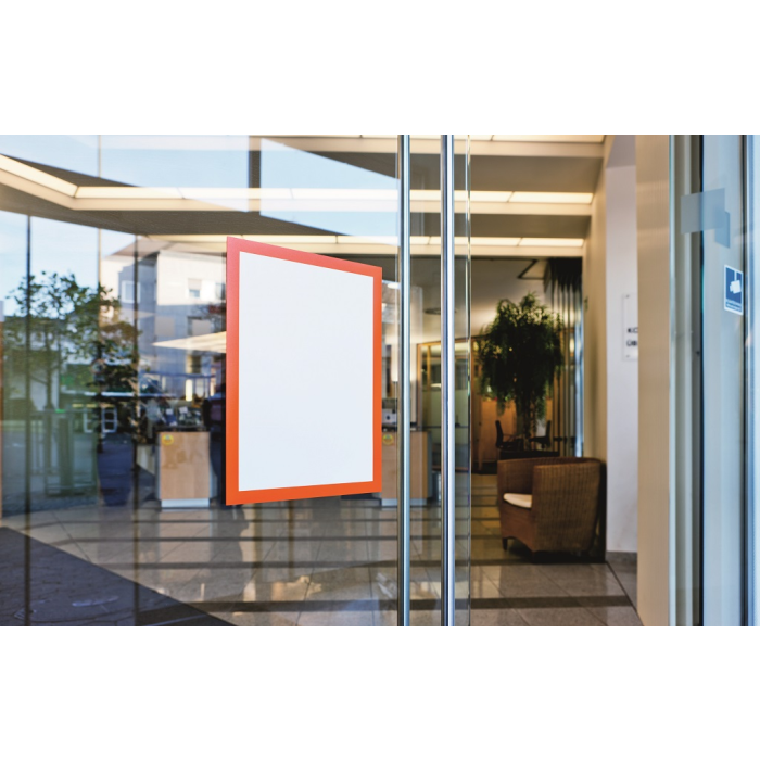 Samolepiaci informačný panel s prednou magnetickou časťou. Ideálny na vystavovanie kľúčových informácií, špeciálnych oznamov alebo dôležitých čísel. Informácie sa ľahko vymieňajú a sú čitateľné z oboch strán, ak sa panel umiestni napr. na okno alebo priehľadné dvere. Vhodný na hladké a pevné povrchy. V prípade potreby je ľahko premiestniteľný bez potreby vŕtania. Rámik vo formáte A3. Farba červená.