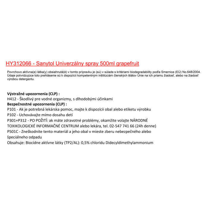 Obsahuje: biocídna aktívna látka (TP2/AL) didecyldimethylammonium chlorid: 5000 mg/kg, <5% neiónovej povrchovo aktívnej látky, <5% katiónovej povrchovo aktívnej látky, Dezinfekčné prostriedky, Parfumy