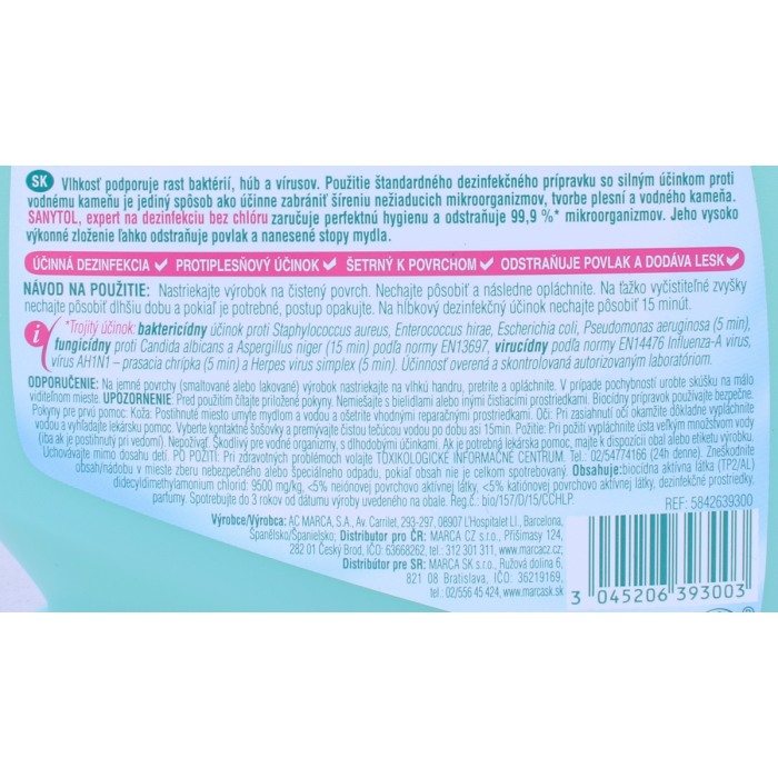 Obsahuje: Biocídne aktívne látky (TP2/AL): 0,95% chloridu Didecyldimethylammonium