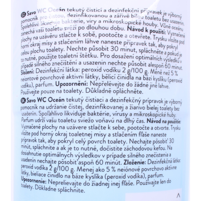 Pri kontakte s pokožkou (ALEBO VLASMI): Vyzlečte všetky kontaminované často odevu. Pokožku ihneď opláchnite vodou (alebo sprchou). PO ZASIAHNUTÍ OČÍ: Niekoľko minút ich opatrne vyplachujte vodou. Ak používate kontaktné šošovky a je to možné, odstráňte ich. Pokračujite vo vyplachovaní. Okamžite volajte TOXIKOLOGICKÉ INFORMAČNÉ STREDISKO alebo lekára.Zozbierajte uniknutý produkt, Zneškodnite nádobu v súlade s platnou legislatívou, umiestnite prázdnu nádobu do komunálneho odpadu. Obsahuje peroxid vodíka, kyselinu amidosírovú.
