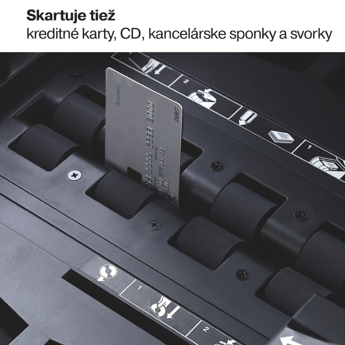 Skartuje CD, kreditné karty, kancelárske sponky a drôtiky zošívačiek"