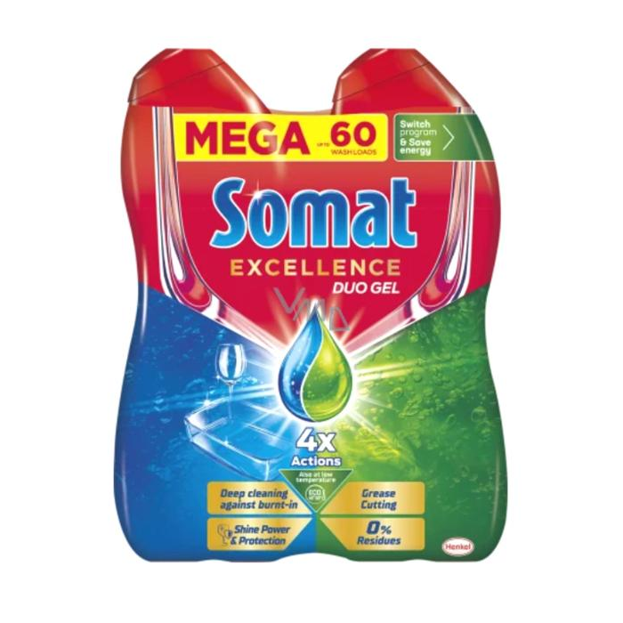 Návod na použitie: 1. Otvorte uzáver a naplňte dávkovač odporúčaným množstvom. 2. Zatvorte uzáver dávkovača a vyberte požadovaný program. Odporúčané dávkovanie: Málo znečistený riad: 18ml. Stredne alebo silne znečistený riad: 28ml. Somat Excellence Duo Gel poskytuje dokonalé výsledky čistenia, aj keď svieti kontrolka soli alebo leštidla. V oboch prípadoch, funkcia leštidla aj zmäkčovadla vody je vo vašej umývačke riadu stále zachovaná. Dodatočné použitie soli a/alebo leštidla je vždy možné. Pri tvrdosti vody >21°dH použite dodatočne soľ Somat Special a leštidlo Somat. Tvrdosť vody môžete zistiť od miestneho dodávateľa vody.