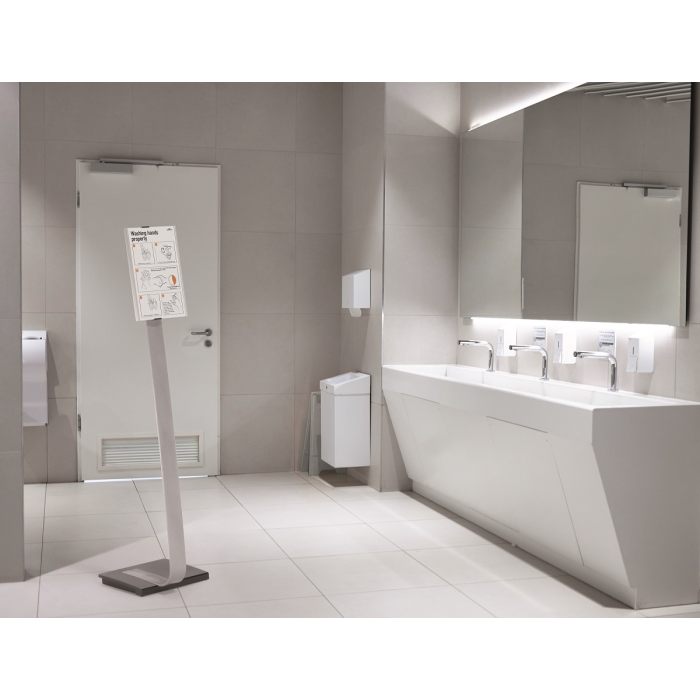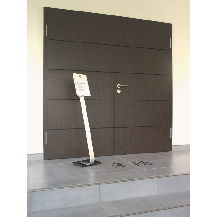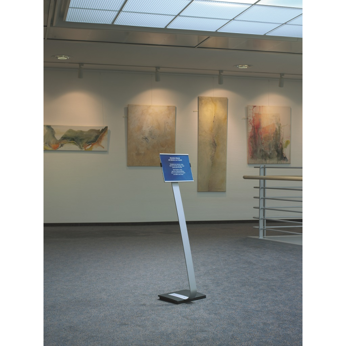 Vysoko kvalitný elegantný hliníkový stojan s informačným panelom formátu A4, použiteľným na výšku alebo na šírku. Zaťaženie stojana a gumové podložky zabezpečujú stabilitu. Protiodrazový panel je možné otočiť vertikálne alebo horizontálne a naklápať v rozmedzí 10 stupňov.Šablóny na potlač sú voľné stiahnuteľné na www.durable.de.