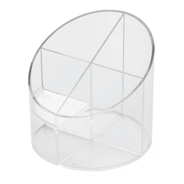 Stojan so štyrmi oddielmi na perá, ceruzky a kancelárske drobnosti z plastu v ekonomickom prevedení. Výška 105 mm, priemer 110 mm. Farba priehľadná číra.
