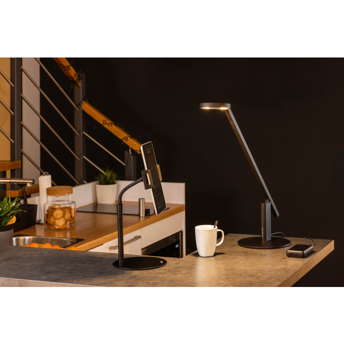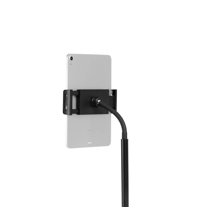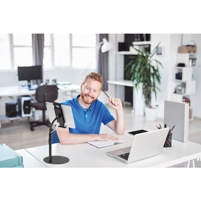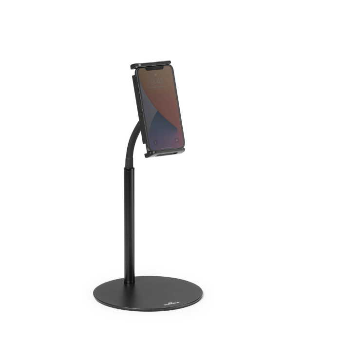 Stojan na stôl s držiakom na tablet a mobilný telefón, vybavený flexibilným ramenom a guľovým kĺbom