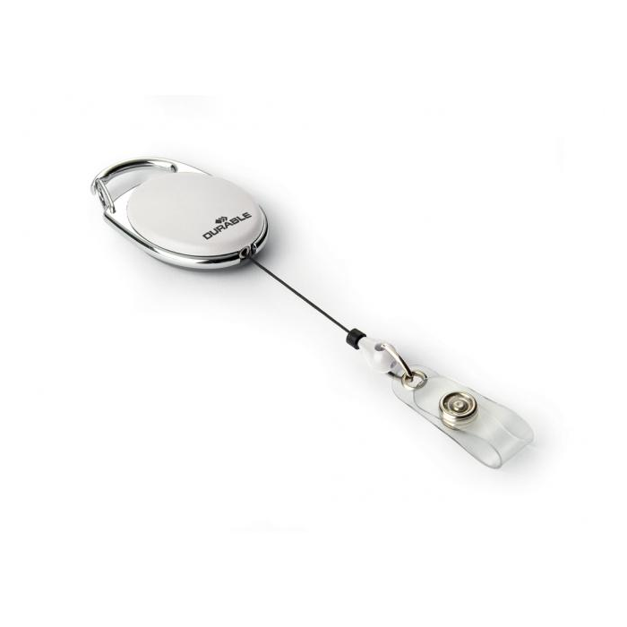 Štýlový oválny vysúvací kotúč s možnosťou vysunutia do 80 cm a kovovým klipom na rubovej strane. Vhodný na uchytenie všetkých visačiek značky DURABLE s perforáciou. Balenie 10 ks.