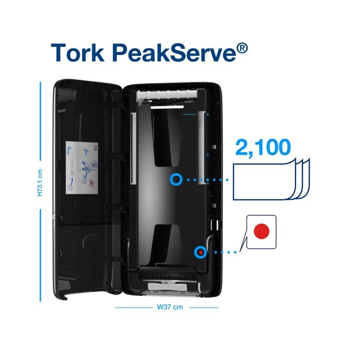 Tork PeakServe®: najnovšia inovácia navrhnutá pre vysoko frekventované toalety a umyvárne, kde personál potrebuje maximalizovať čas upratovania a udržať dobrú plynulosť pre návštevníkov. Systém je kompatibilný s nadväzujúcimi utierkami na ruky Tork PeakServe®. Má vysokú kapacitu nad 2 100 utierok, ktoré dokáže dávkovať rýchlo a plynulo bez prerušenia. Stlačené náplne sa rýchlo dopĺňajú a môžete ich kedykoľvek doplniť. Ľahko sa uskladňujú a prepravujú, vďaka čomu umožňujú personálu sústrediť sa na upratovanie a nie na dopĺňanie.