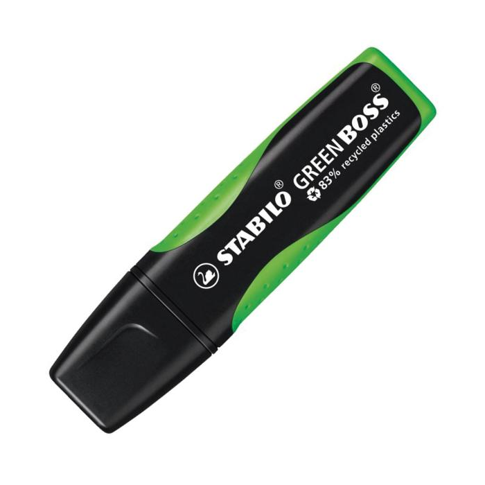 STABILO GREEN BOSS. Zvýrazňovač vyrobený z 83% recyklovaného plastu pre školákov, študentov, učiteľov a zamestnancov kancelárie, ktorí sú ohľaduplní k životnému prostrediu. Štýlový dizajn s protišmykovou zónou úchopu. Technológia STABILO Anti-Dry-Out chráni pred vysychaním po dobu 4 hodín a zaisťuje koncentrovanú prácu. Zvýrazňovač je možné ľahko a pohodlne doplniť náplňami STABILO BOSS ORIGINAL. Atrament na vodnej báze. 2 šírky stopy 2 + 5 mm. Farba zelená. Väčšie balenie 10 kusov.